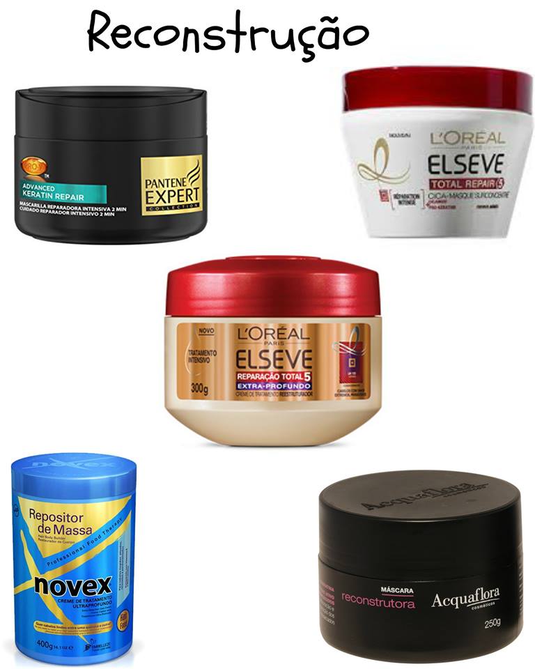 A reconstrução capilar que é responsável por praticamente toda estrutura do nosso fio, serve para repor a queratina do nosso cabelo, sendo assim encontramos vários produtos no mercado que vem com queratina ou até mesmo a queratina pura(líquida, em gel, ou creme). Uma forma muito interessante é usar a gelatina incolor para fazer a sua etapa de reconstrução fácil e barato veja aqui como fazer. Os produtos recomendados para essa etapa são aqueles que contém: