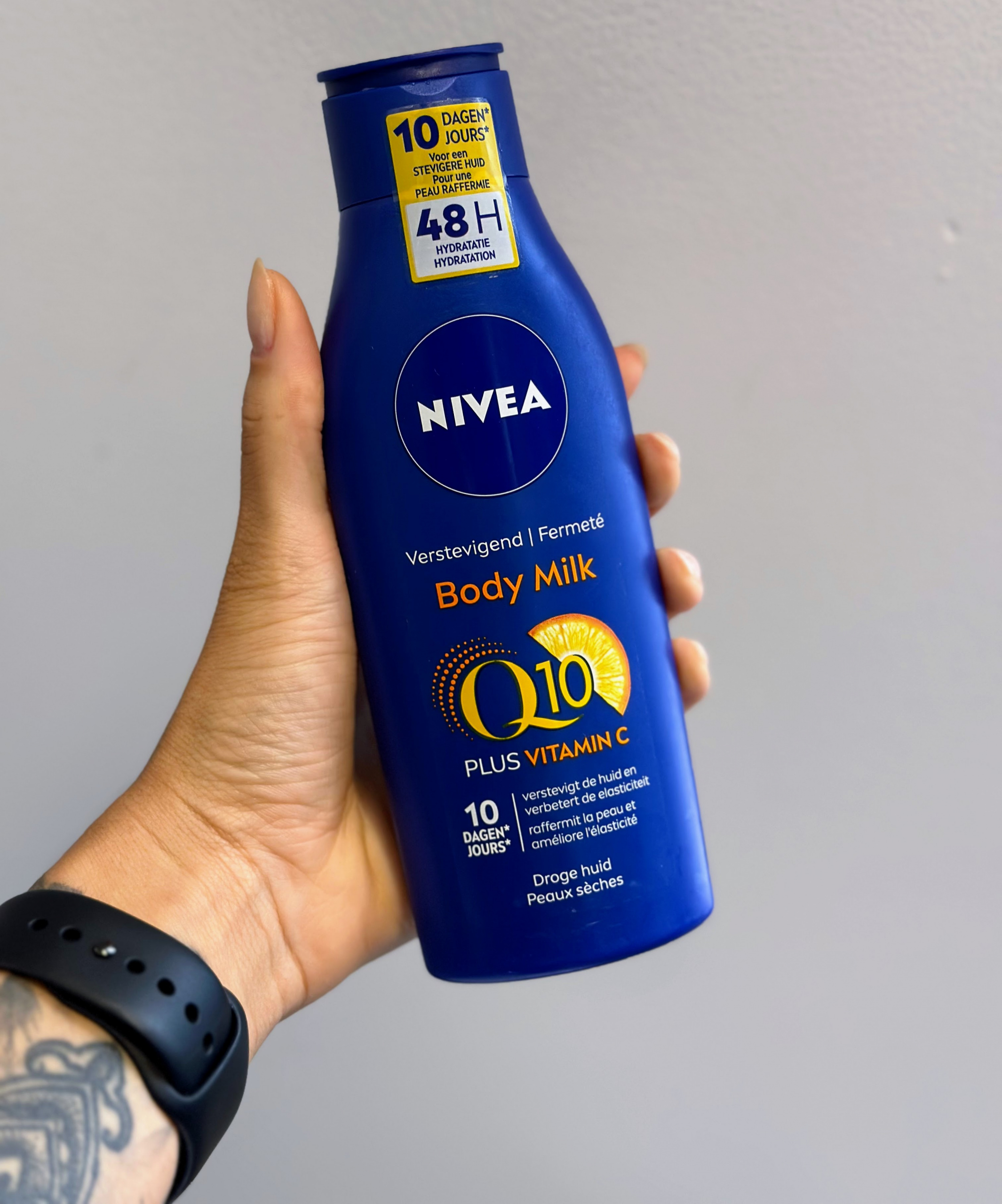 Na pele eu uso o meu favorito Nivea Q10 firmador que super hidrata e deixa a pele maravilhosa.