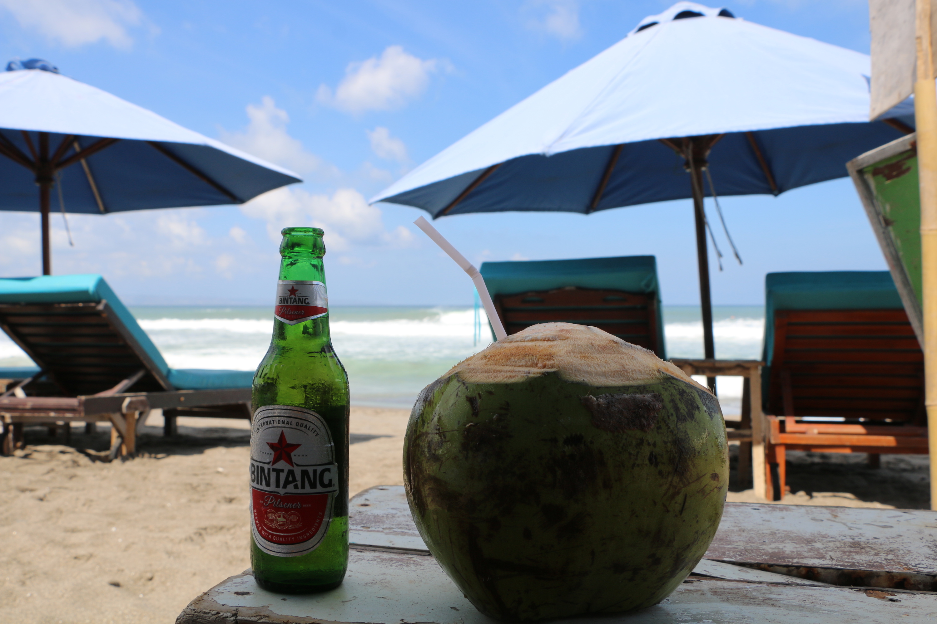 Para quem gosta de umas biritas, vai encontrar várias barraquinhas na beira da praia com algumas opções, a mais conhecida e a “Bintang” e é claro uma agua de coco que não pode faltar.