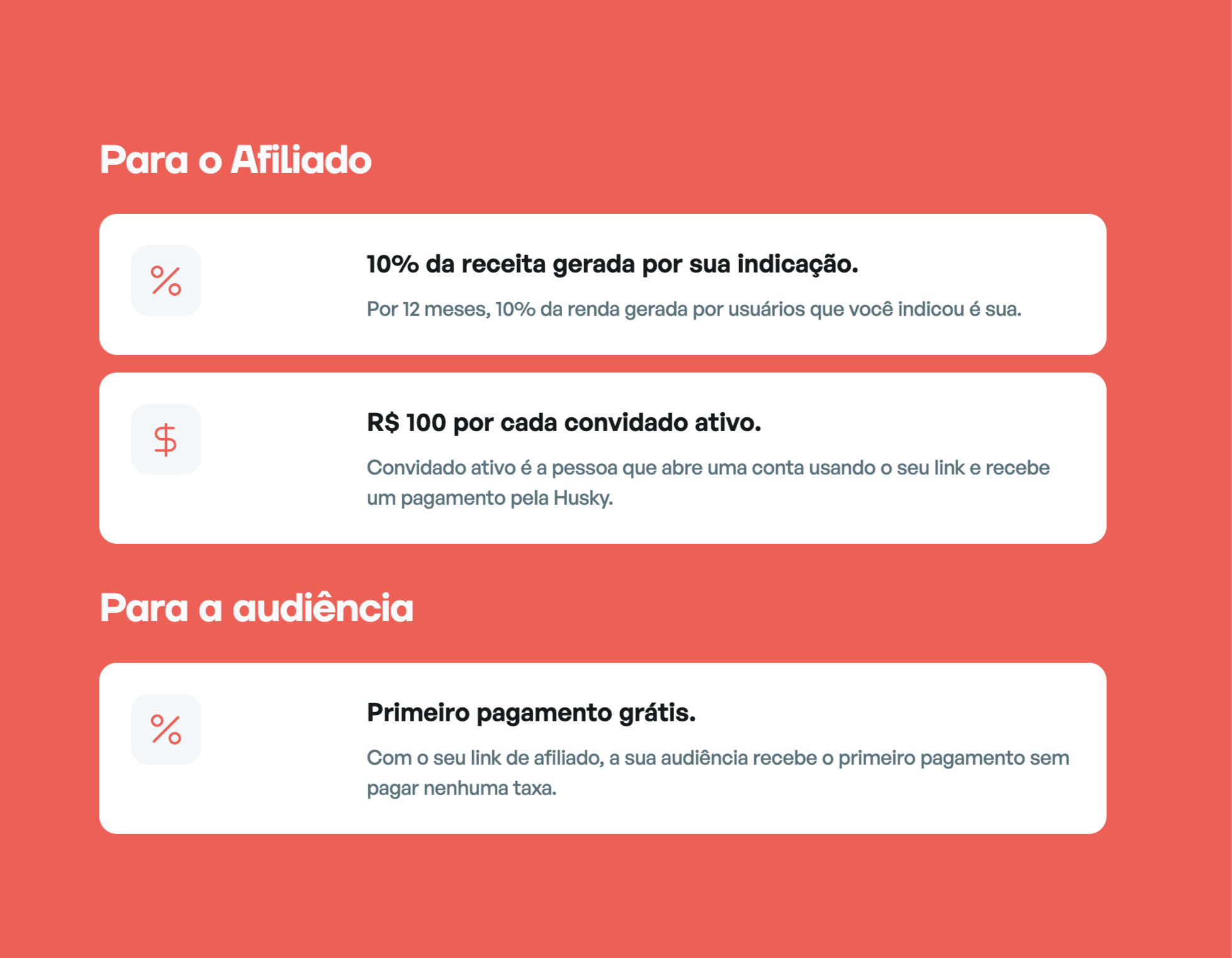 - R$ 100 por cada convidado ativado - Convidado ativo é a pessoa que abre uma conta usando o seu link e recebe um pagamento pela Husky.
