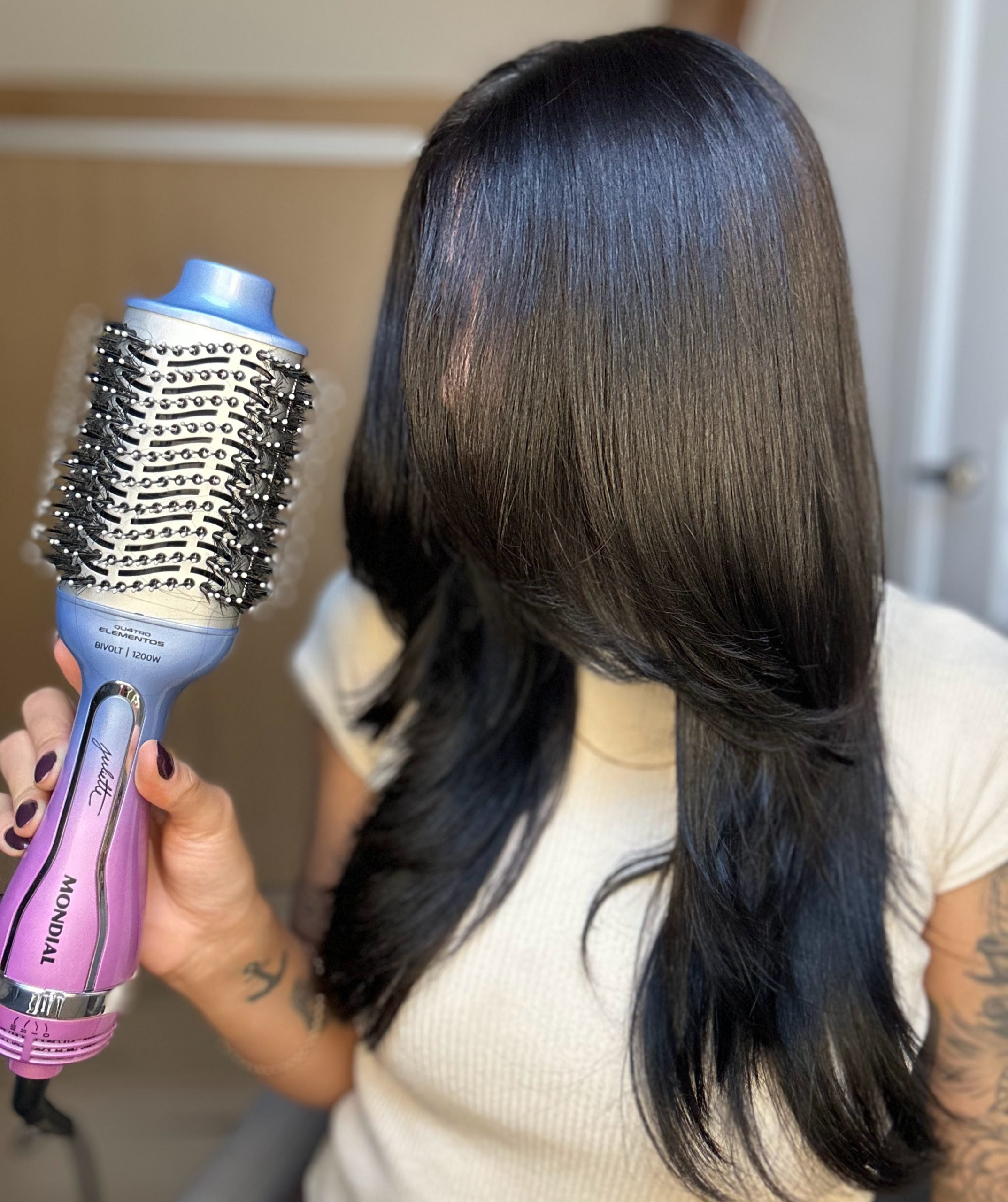 Essa foi a primeira vez que utilizei[/caption] A Escova Secadora da Linha by Juliette Qu4tro Elementos traz um revestimento especial enriquecido com infusão de Cerâmica, Titânio, Tourmaline e Nano Silver. Esses 4 elementos, juntos, protegem seus fios e garantem uma aparência mais saudável aos cabelos, com brilho intenso, maciez e sem frizz. Saiba mais sobre a Escova Secadora ES-JU-03