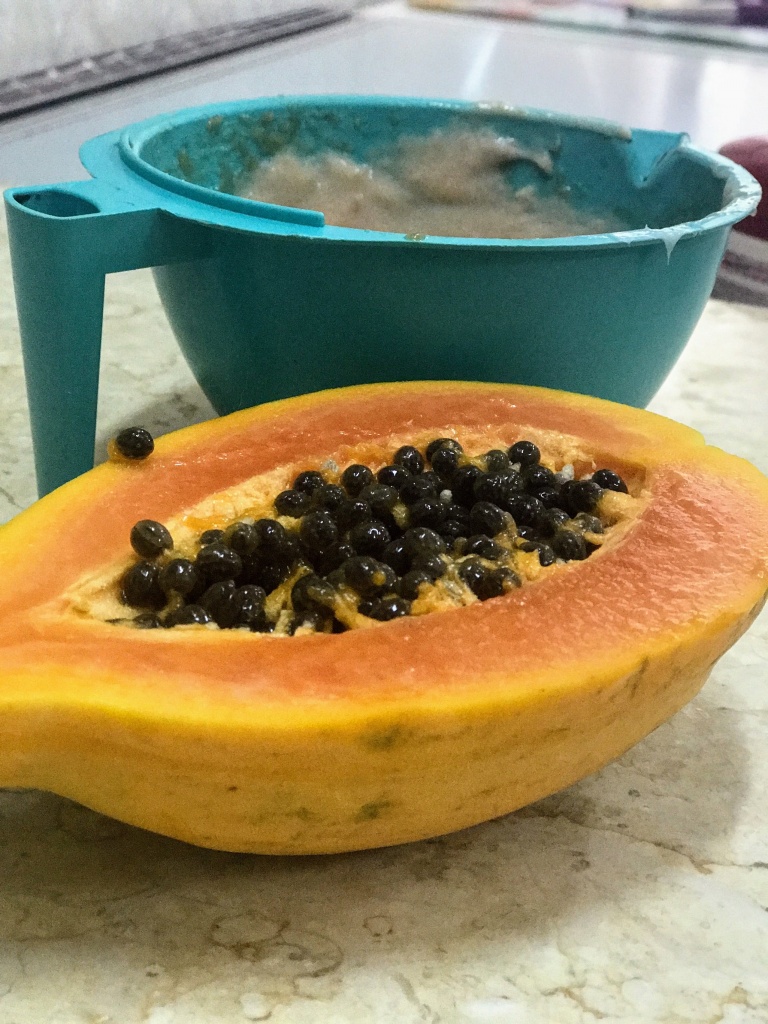- Pegue um pedaço pequeno de mamão e bata no liquidificador ou amasse com um garfo.