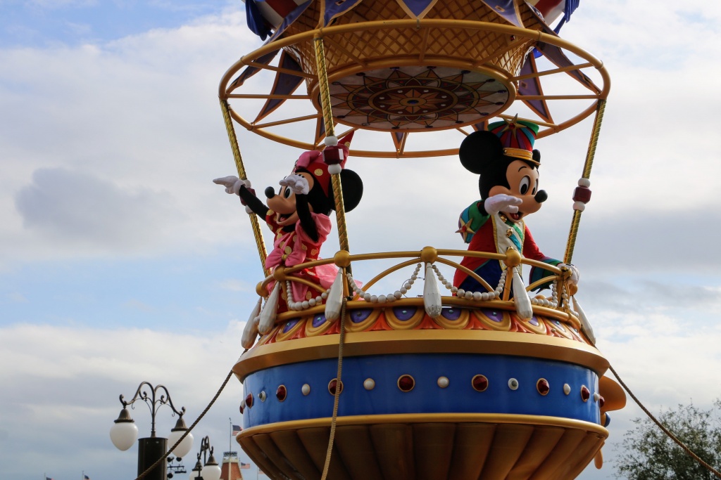 E um desfile que acontece nas ruas do parque, com vários personagens como mikey mouse, minie, Cinderela, Pateta e outros. Dizem que eles sempre muda os desfiles. e acontece vários em um mesmo dia.