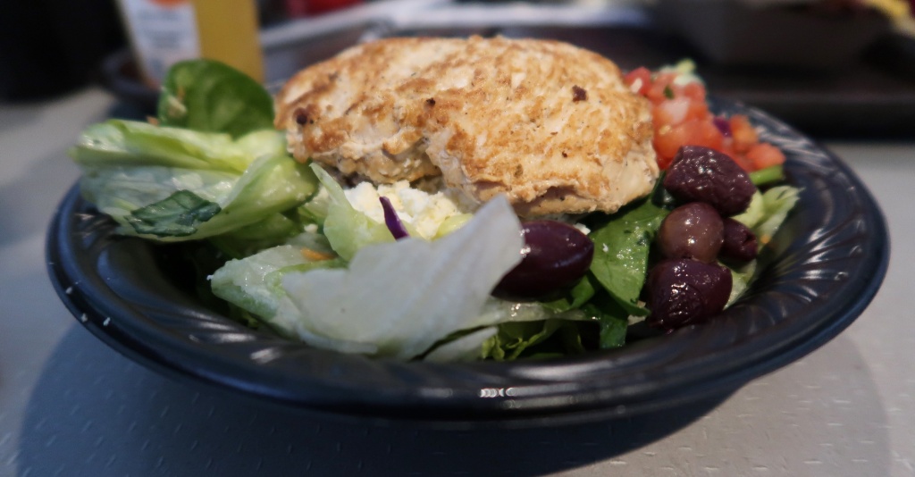 Em todo o parque existe varias barraquinhas com lanches como ; pipoca, batatas, hot dog, churros, sorvetes e outros. Mas também tem uma variedade de restaurantes com comidas de verdade, sanduiches, pizza, café da manhã e outros. Comemos no ” Cosmic Ray’s. Eu pedi uma salada com um file de frango que não estava espetacular rs mas estava gostoso, e o mozão pediu um hamburger com batatas fritas que parecia uma delicia. Também comemos pipoca, tomamos sorvetes, café, tudo em torno de 5,00 doletas pra cima.