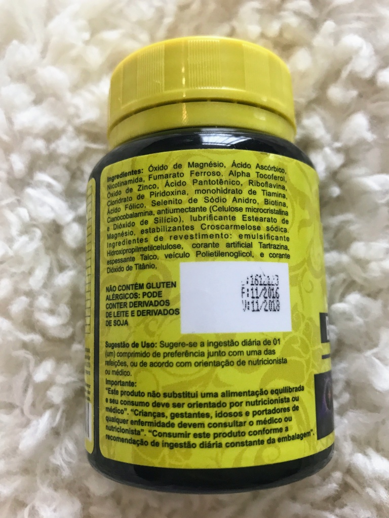 Óxido de magnésio, Ascórbio, Vitamina B3 (Nicotinamina), Ferro (Fumarato ferroso), Alpha Tocoferol, Zinco, Pantotênico, Ribofiavina, cloridrato de Piridixina, Vitamina B1 (Monohidrato de Tiamina), Vitamina B9 (Ácido fólico), Selenito de Sódio Anidro, Vitamina B7 (Biotina), Lubrificante estearato de Magnésio, estabilizantes Croscarmelose sódica e Vitamina A.
