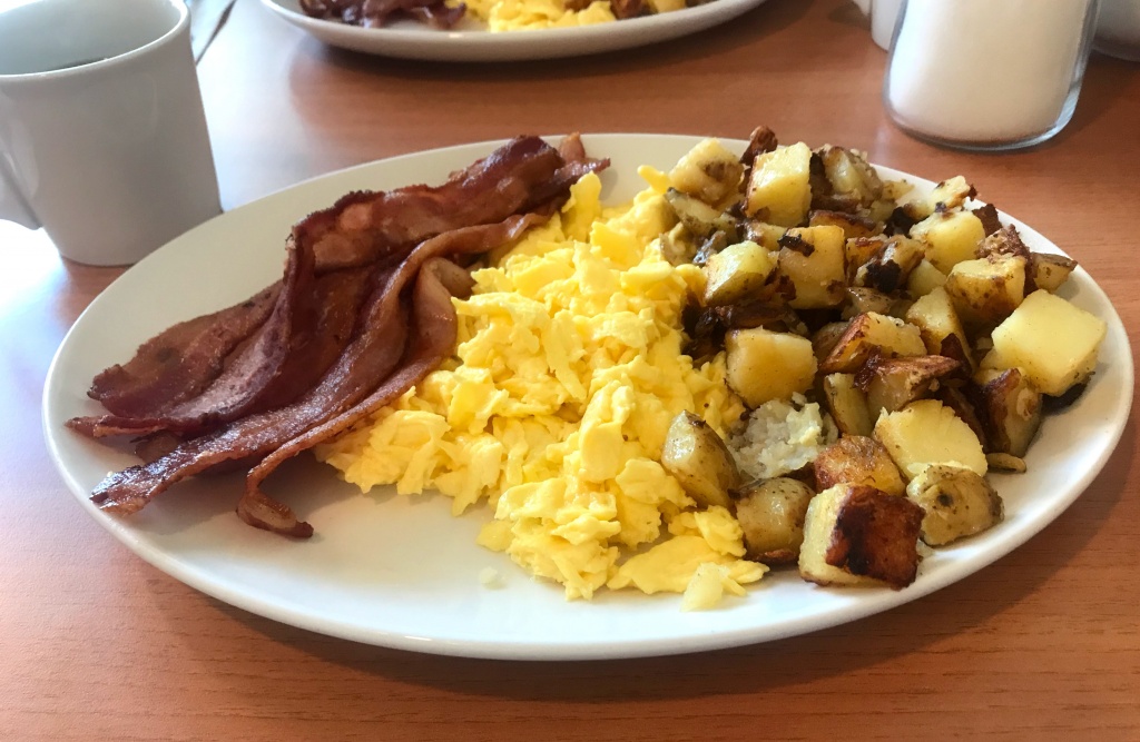O café da manhã mais pedido é o THREE EGGS Served with home fries and thick toast. É esse da foto, quase um café da manhã e um almoço junto rsr.
