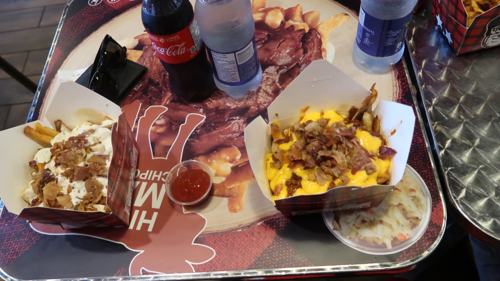Não poderia deixar de começar com uma comida típica do canada que é o poutine, basicamente o prato é feito com batatas fritas, queijo e um molho marrom feito com farinha de trigo e caldo de carne ou galinha, pelo que pesquisei. Mas existe vários restaurantes especializados e servem várias opções. Eu pedi um com cheddar e bacon e amei!