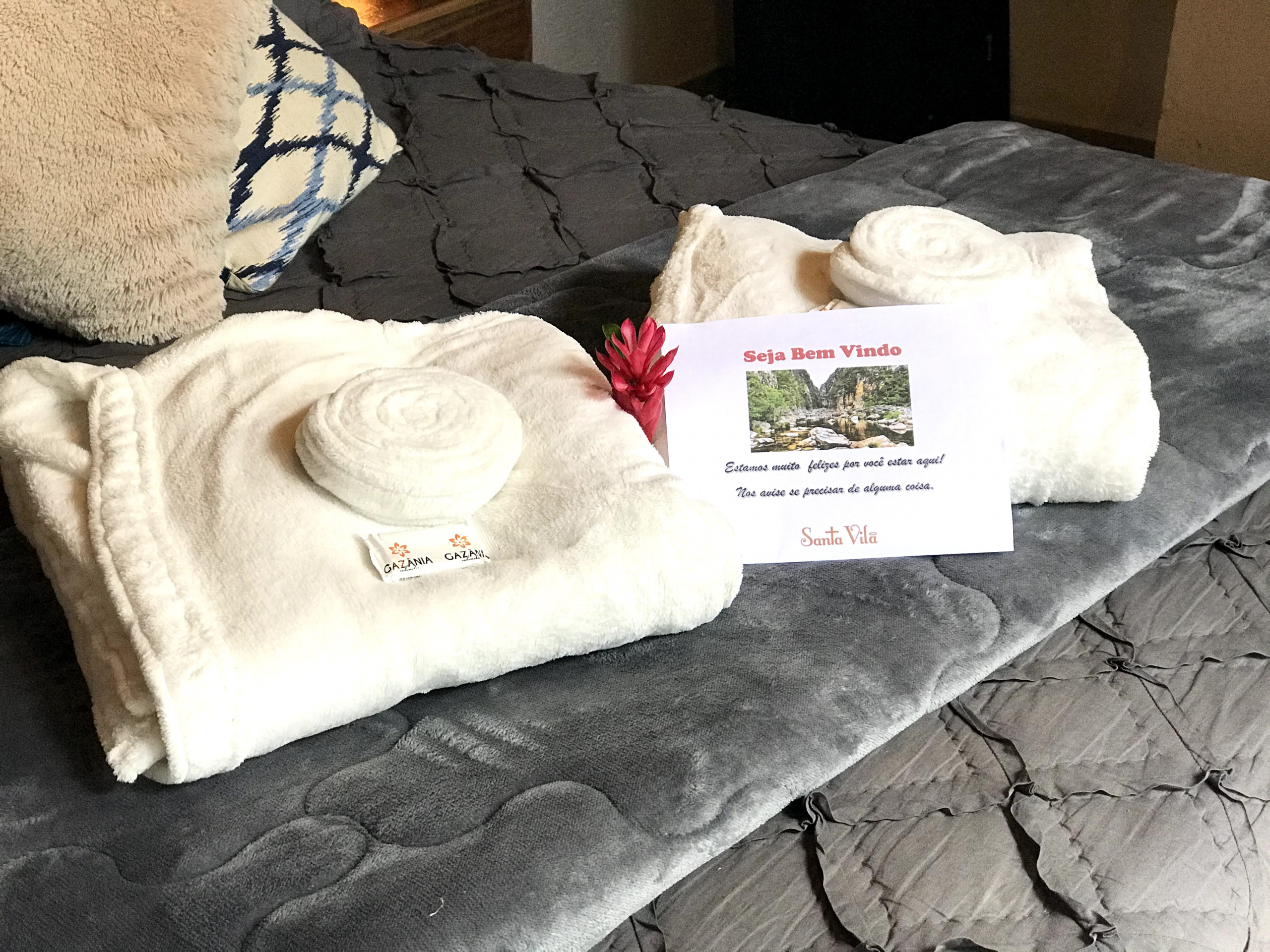 Estava tudo muito limpinho e organizado, com roupões, toalhas e pantufas. E que cama aconchegante!