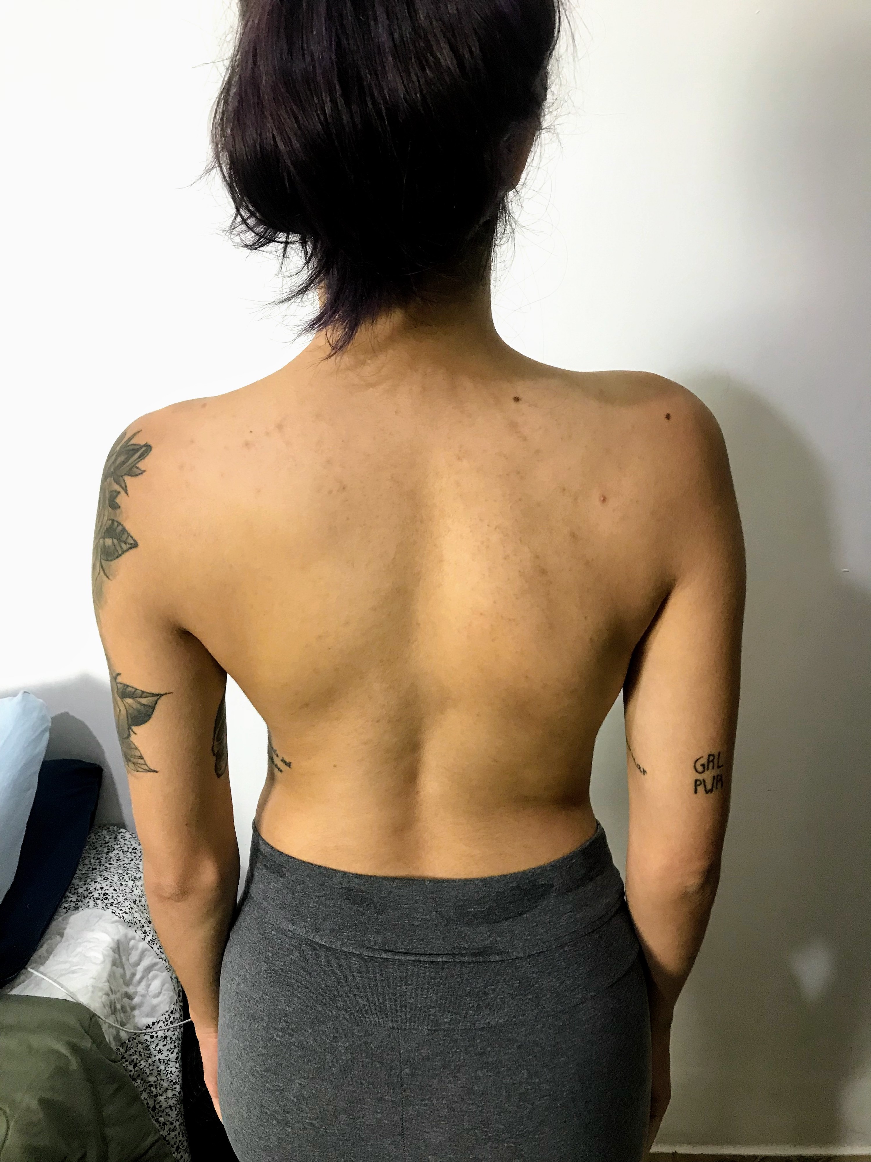 E como puderam ver na foto foi uma melhora muito boa para apenas um mês de tratamento. Ainda não realizei outro raio x para saber se tive melhoras no grau da minha escoliose que até o último raio x eu tinha 47/48 +- graus de curvatura. Como podem ver na foto abaixo que do meu lado esquerdo dava para notar a famosa giba la do meu lado direito.