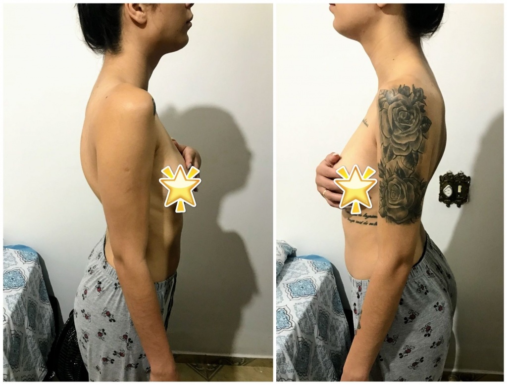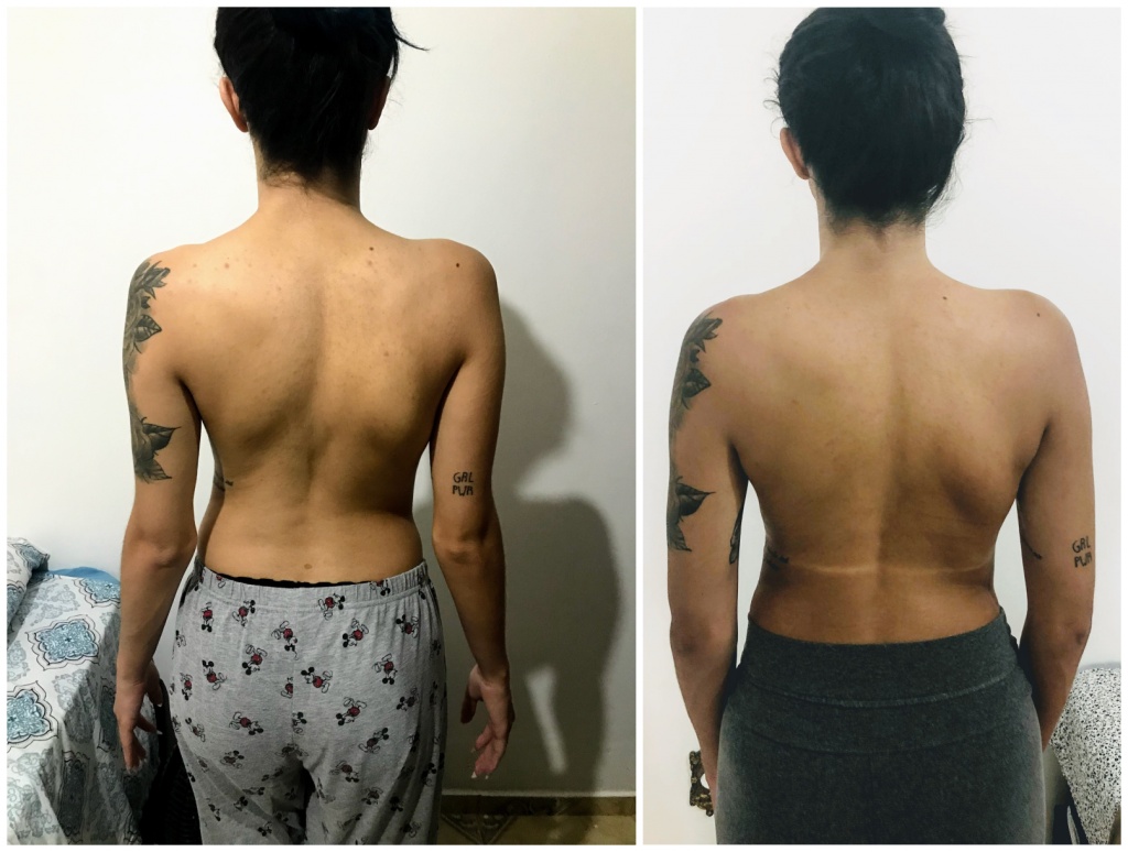 E por fim uma ao lado da outra para vocês verem melhor, a do lado esquerdo como podem ver é do inicio do tratamento. E a do lado direto foi tirado depois de mais ou menos 4 meses de tratamento no dia 30 de Outubro de 2018. E olhem na foto abaixo como a curvinha da minha cintura diminuiu quase 100% e olha como os meu ombros e meus braços estão bem mais alinhados. Acho que dei um pulo de felicidade aqui vendo essa foto.