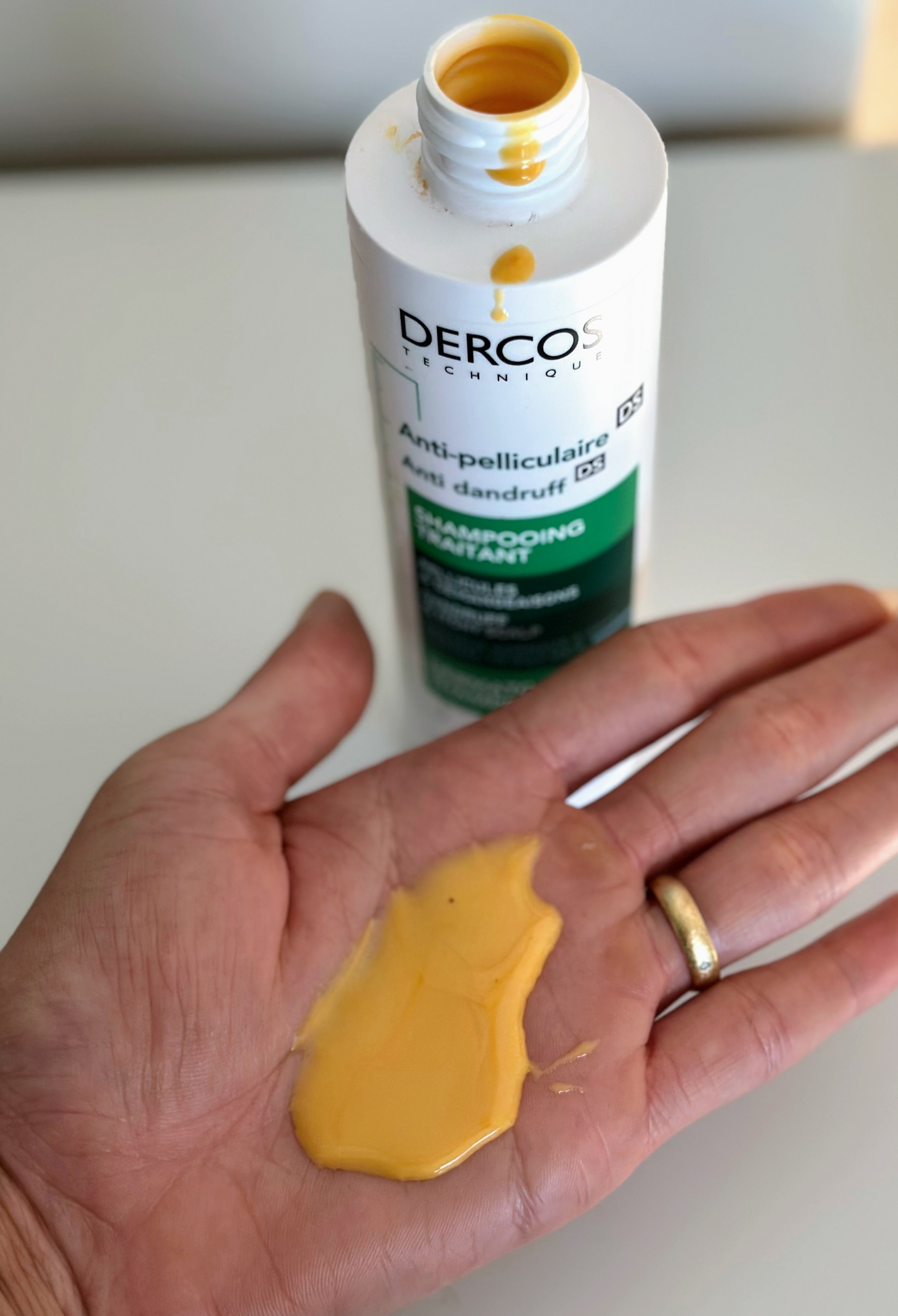 DERCOS Anticaspa DS mantém a sensorialidade, com uma textura laranja e cremosa concentrada em dissulfureto de selénio.