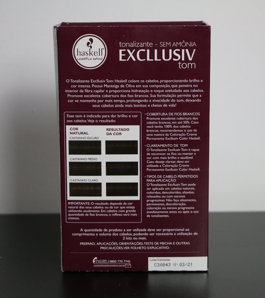 O kit contém 1 bisnaga de 40g de tonalizante sem amônia, 1 frasco aplicador de 60ml de emulsão reveladora, 1 sachê de 30g de tratamento pós coloração, 1 par de luvas descartáveis e um folheto explicativo. Na própria embalagem vem várias informações sobre o produto.