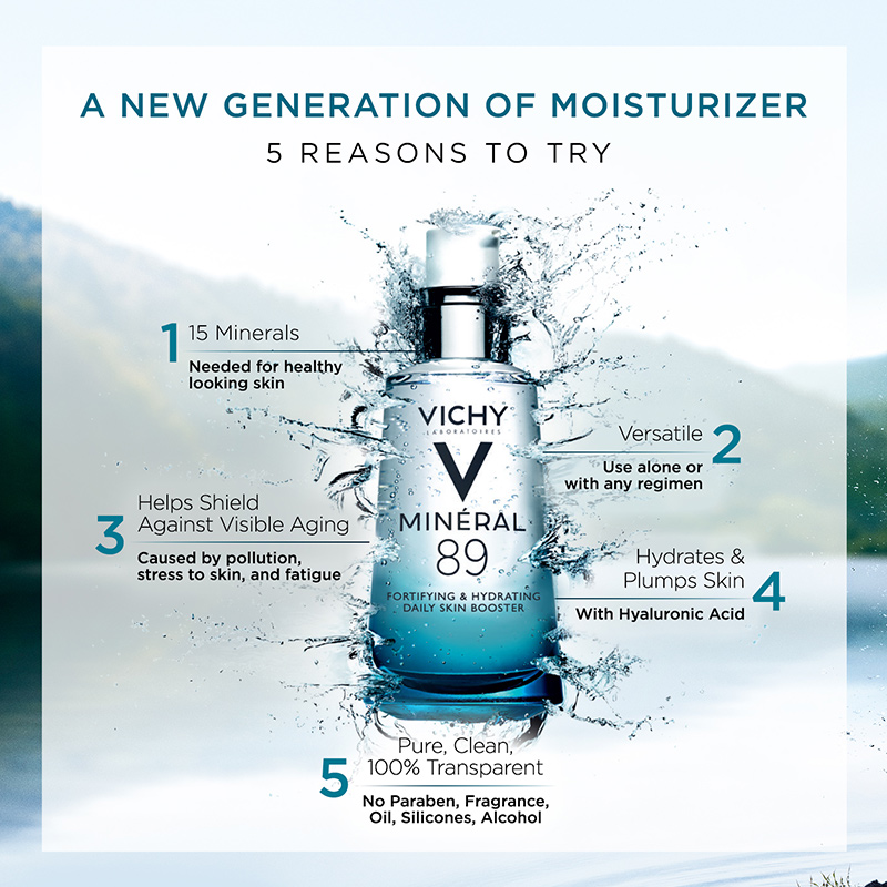 O produto é uma concentração de 89% de Água Mineralizante Vichy, associada ao Ácido Hialurónico de origem natural. Minéral 89 reforça a função barreira, para aumentar a resistência da pele contra as agressões diárias, como o stress, a poluição e a fadiga. A pele fica hidratada, tonificada, radiante e visivelmente saudável. Eficácia comprovada clinicamente sob controlo dermatológico.Para todas as mulheres, todos os tipos de pele. Minéral é o novo 1º gesto de todas as rotinas de cuidado das mulheres que vivem ambiente urbano, já que reforça a função barreira, tornando a pele mais resistente às agressões. Alta tolerância: uma fórmula hipoalergénica com apenas 11 ingredientes, sem perfume, corantes, silicone, parabenos ou álcool.* Testado sob controlo dermatológico e oftalmológico. Adaptado para a pele mais sensível.
